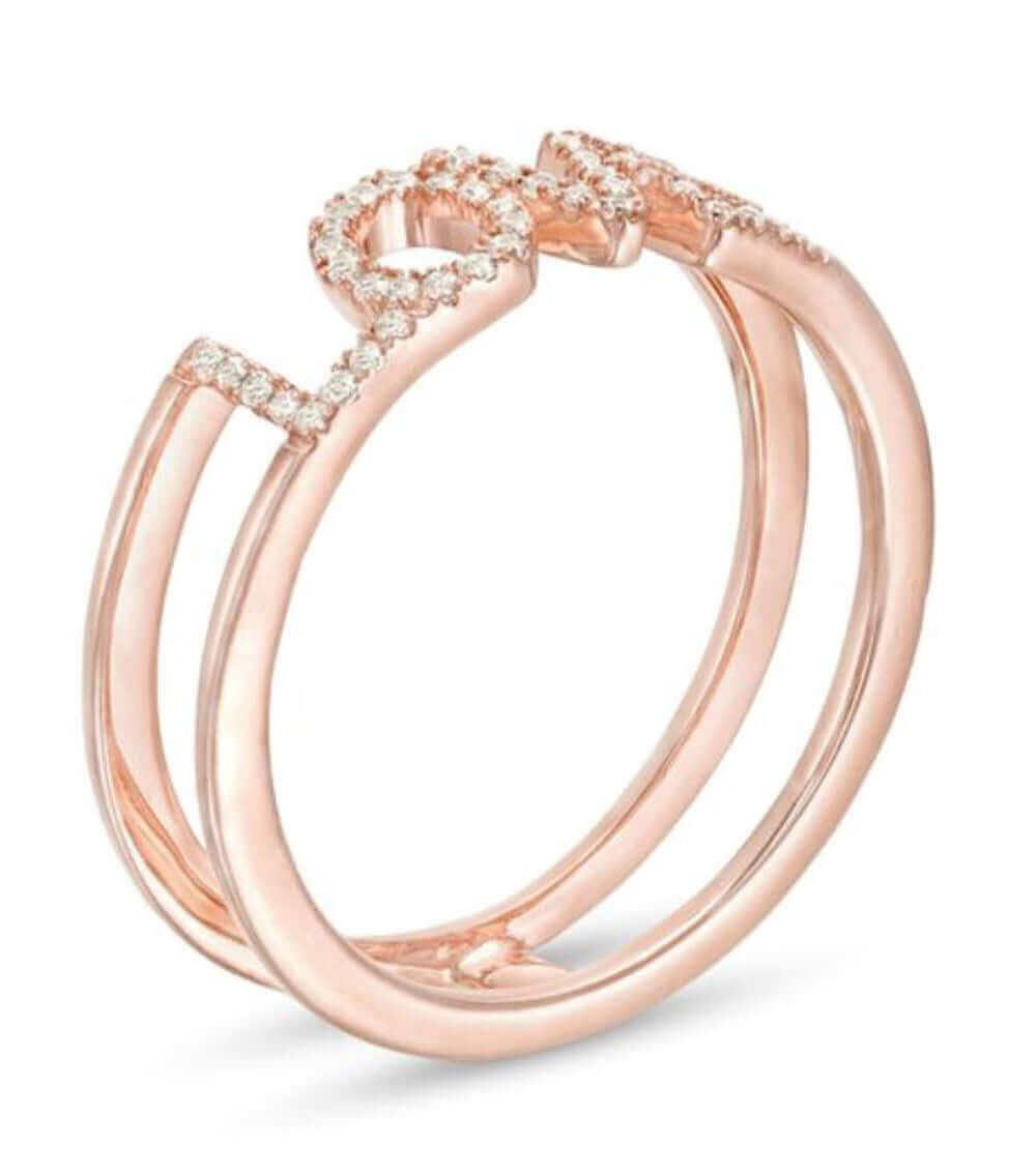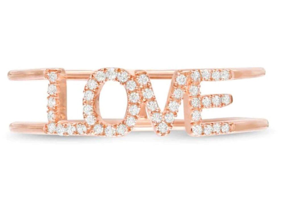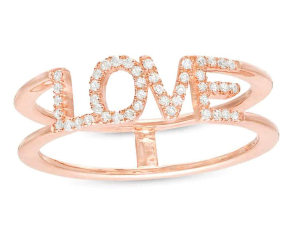 Sleek, chic and oh-so sweet, this diamond ring from the JewelMore LOVE Collection is your new go-to style. Fashioned in warm. Crafted in 10K Rose Gold, this flirty design features the word "LOVE" sculpted in an uppercase font and lined with glistening diamonds. 1/8 CT. T.W. Diamond "LOVE" Parallel Split Shank Ring in 10K Rose Gold the signature of the collection and a symbol of faithfulness and everlasting love.